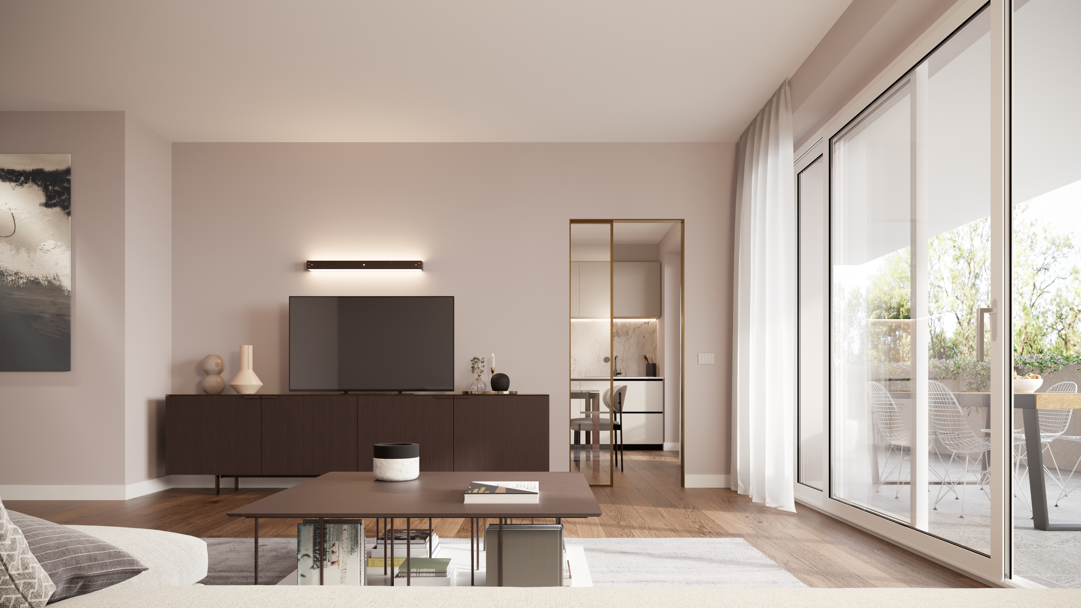 L’appartamento B3 è posizionato al piano terra ed è composto da: ingresso, soggiorno-pranzo con cucina abitabile, due camere da letto, due bagni di cui uno al servizio della camera matrimoniale, due terrazzi di cui uno con accesso sul giardino di proprietà e cantina al piano interrato.